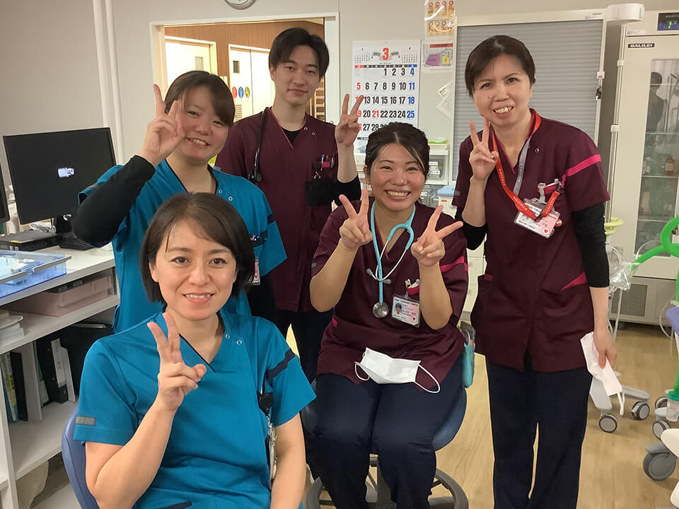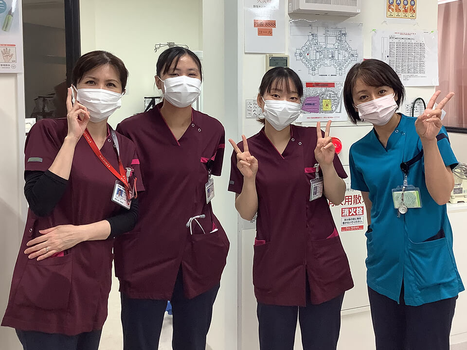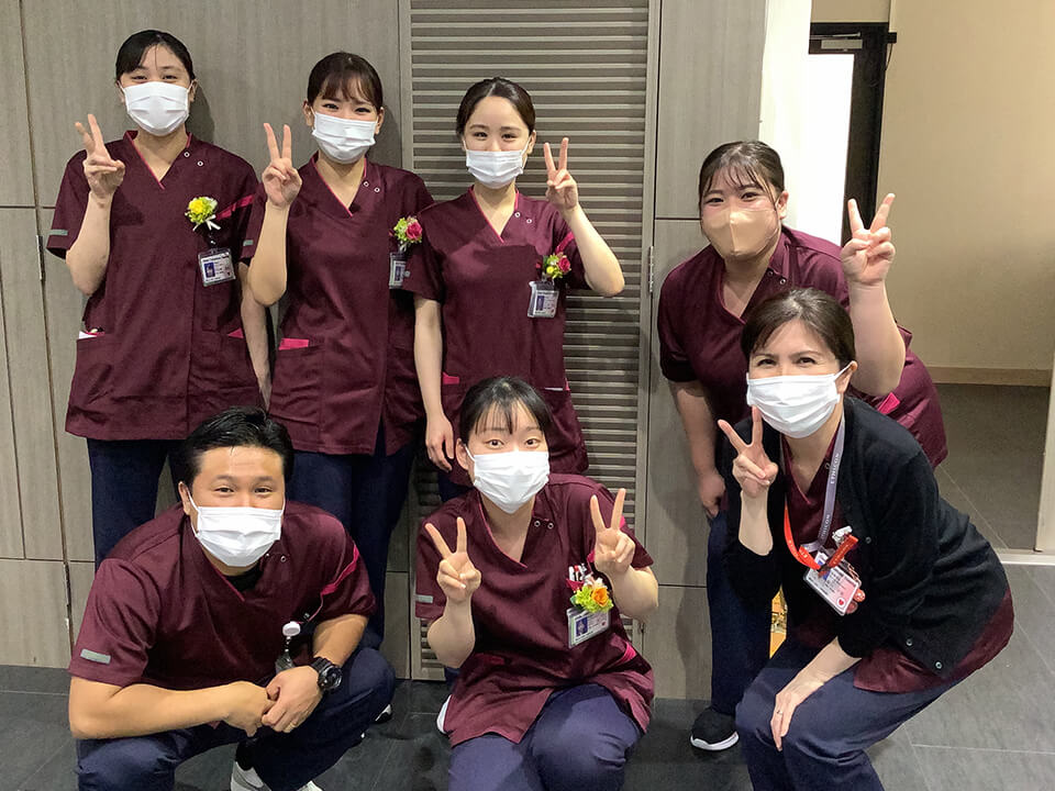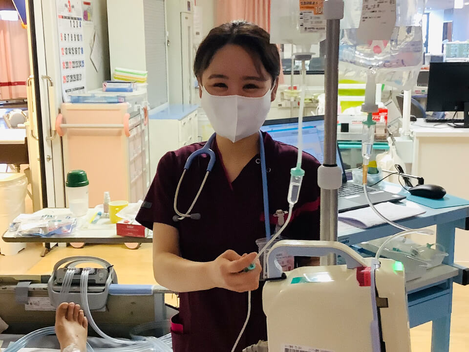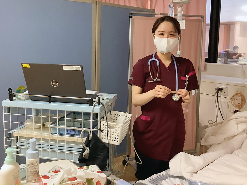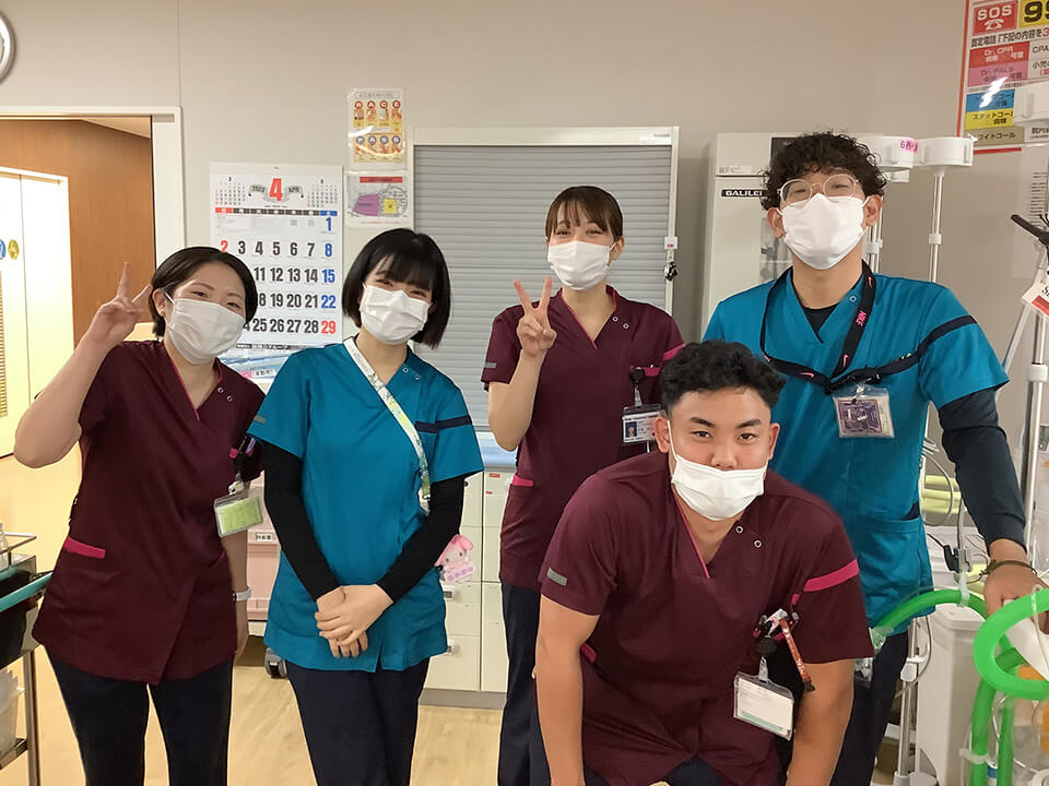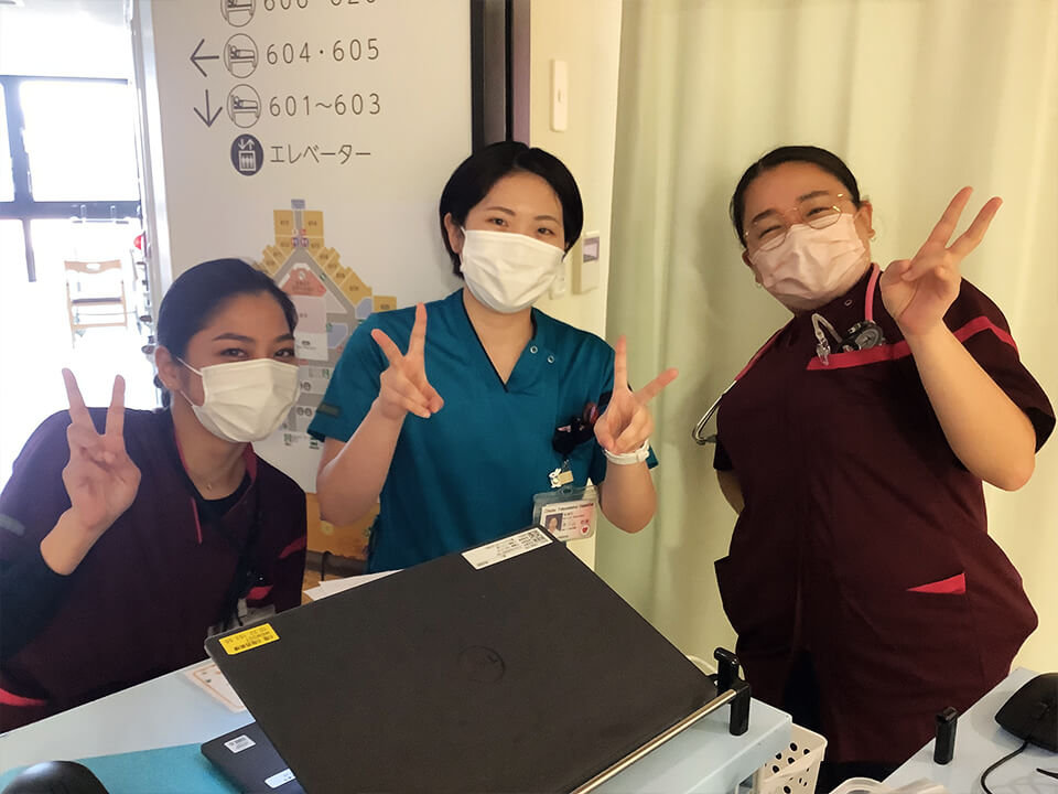 入職時は、業務を覚えることに必死で、患者さん一人ひとりに向き合うことができず、悩むことも多くありました。そんな時、先輩看護師にわからないことを相談したり、同期と日々学んだことや反省点を共有しながら働くことで、少しずつ患者さんに向き合えるようになってきたと感じています。皆さんと一緒に働けるのを楽しみにしています。