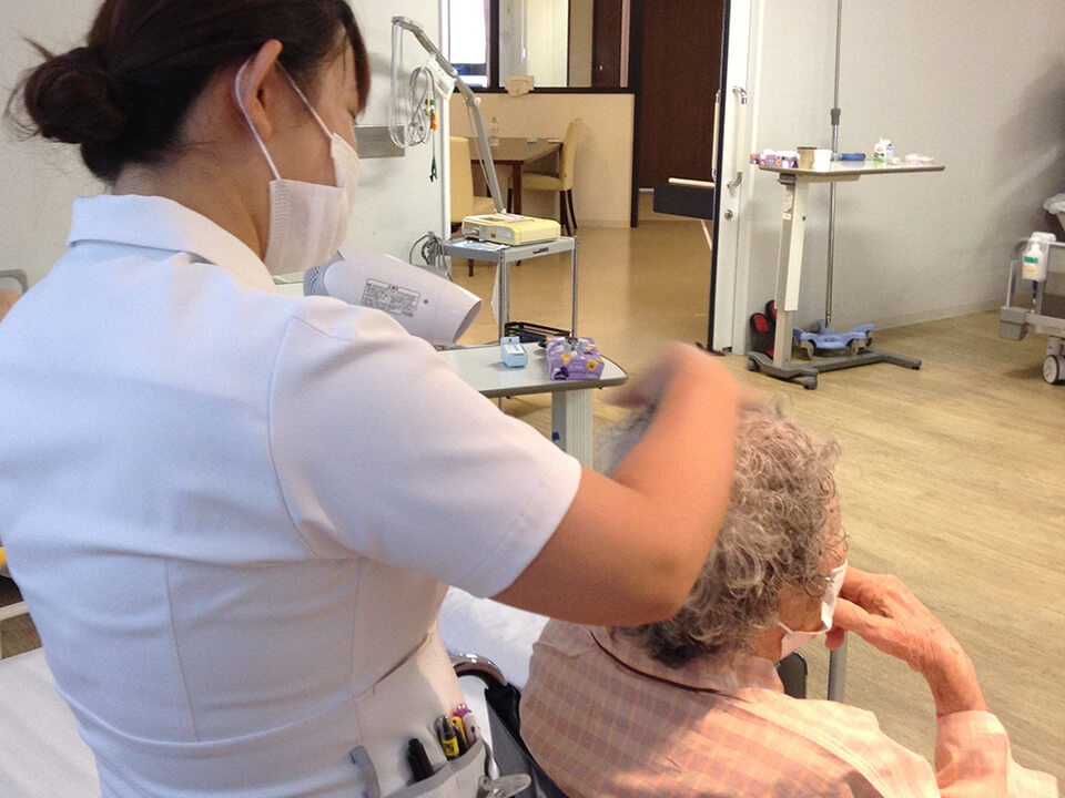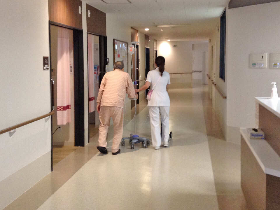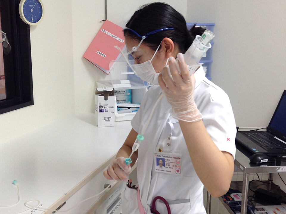 当病棟は主に肺炎や尿路感染症の急性期の患者様が多い病棟です。血液疾患では、無菌室を増設し、化学療法導入期の患者様や骨髄移植療法の患者様を中心に、苦痛緩和と感染予防の看護ケアを行っています