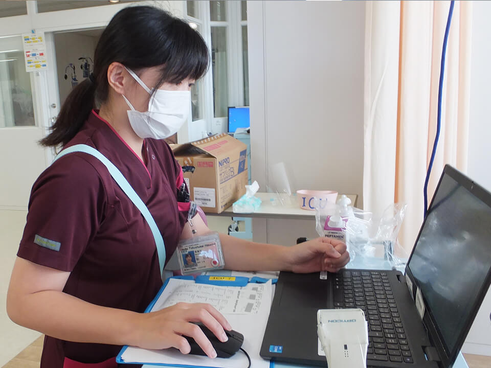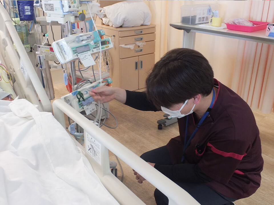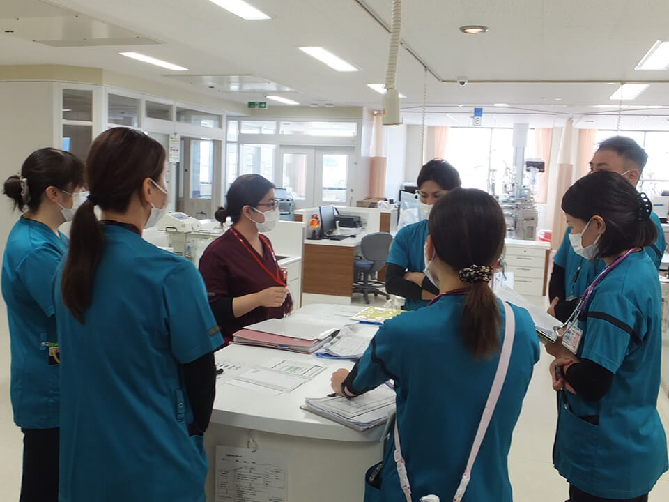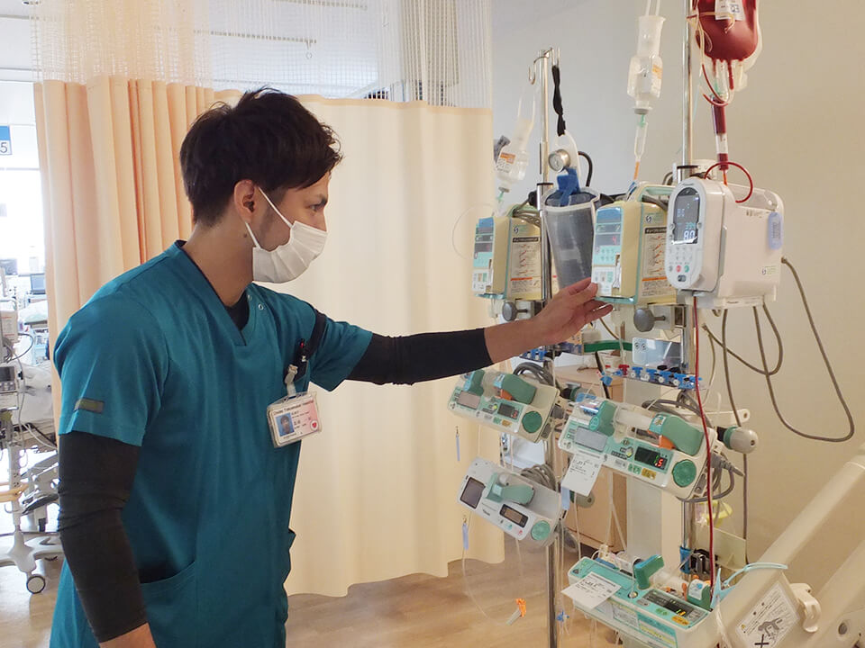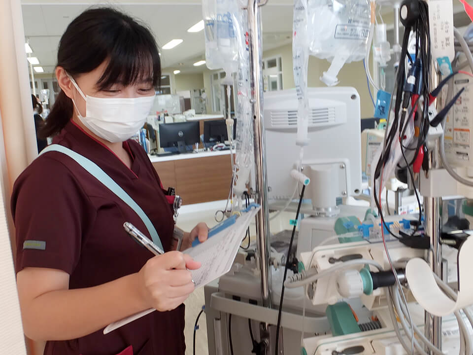 私は入職してICUに配属されました。ICUは重症な患者様が多く難しい疾患や薬剤、多くの医療機器などがあり、ひとつひとつ覚えるのが大変でした。しかし、先輩方が優しく声をかけてくれ、分からない事を丁寧に教えてくれたことで日々成長する事ができました。今ではリーダー業務や重症な患者様を受け持たせて頂いています。まだまだ学ぶ事は多くありますが、充実した毎日を過ごしています。