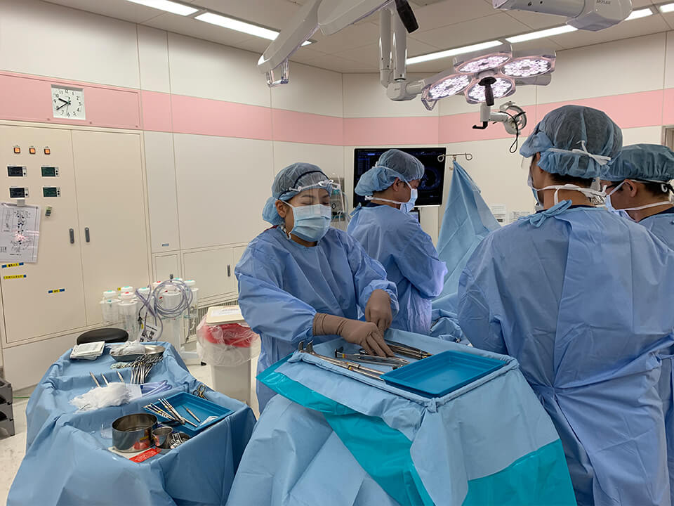私たち手術室看護師は、高度で複雑な医療機器を毎日扱うため、安全で質の高い医療を提供できるよう多職種と連携し、チームで手術のサポートを行います。手術看護歴1年目の新人から20年越えのベテランまで幅広い構成となっており、手術を受けられる患者・ご家族様に寄り添い、不安や緊張を少しでも軽減できるよう努めています。