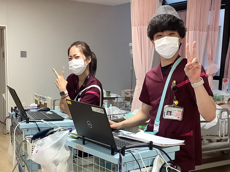 また、先輩達がとても優しく、わからないことや不安なことがあるとすぐに先輩に質問し、一緒に考えてくれたりと学びを深めてくれるためとても働きやすい病棟です。時にはきつい事もありますが、同期もとても仲がよく、みんなに支えられながら乗り越えてきました。スタッフ間も仲がよいのでぜひ、一緒に働きましょう♪お待ちしています♪